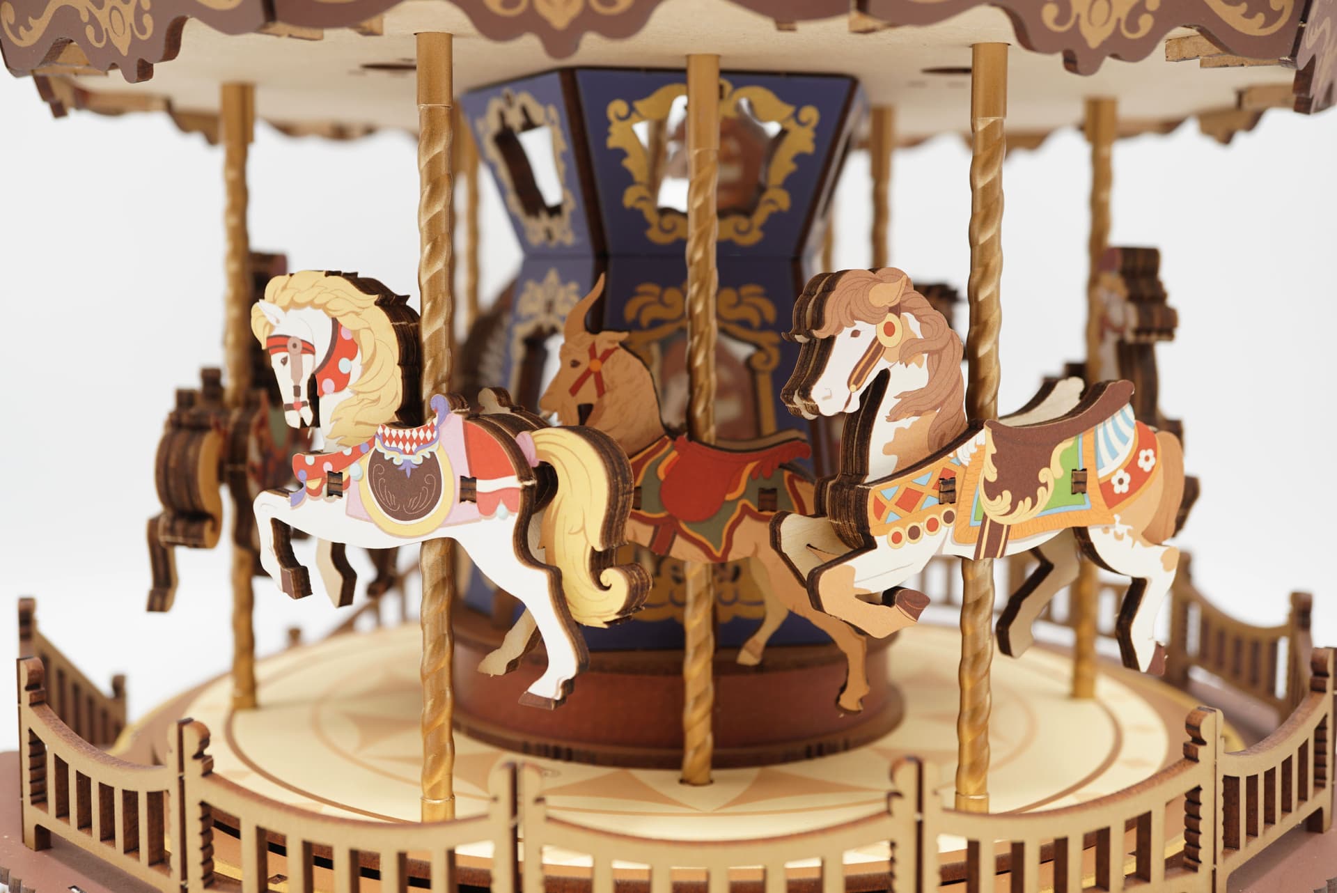 Crafted with high-quality injection-molded figures and a vintage-style base, the music box features a golden horse leader and 8 vividly colored mounts: zebra, white horse, antelope, reindeer, and more. - 4 Classic Melodies & 2 Rotation Modes